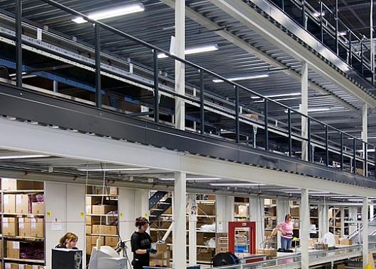 Половина склада оснащены 3-уровневой системы / уровня стеллажей, а другая половина с 3-уровневой стеллажной системы / уровня для поддонов половиной. Объем продукции упакованы в картонные коробки и на поддоны хранятся в стеллажах потока поддон. Конвейеры перемещать товары между уровнями и стоек и на к зоне отгрузки.