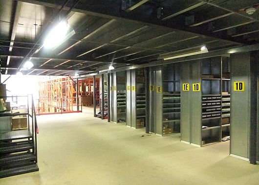 Системы хранения ООО установлен Dexion Двухуровневая HI-280 Стеллаж & Longspan Стеллажи поддерживается мезонине структура 6м высокой х 36м долго х 42 м в ширину обеспечения 500 полочного заливы на уровне первого этажа и 1-го уровня пола для хранения мелких деталей и 150 бухт складские стеллажи купить для Storge больших частей. Верхний уровень пола остался ясно для хранения громоздких предметов.
